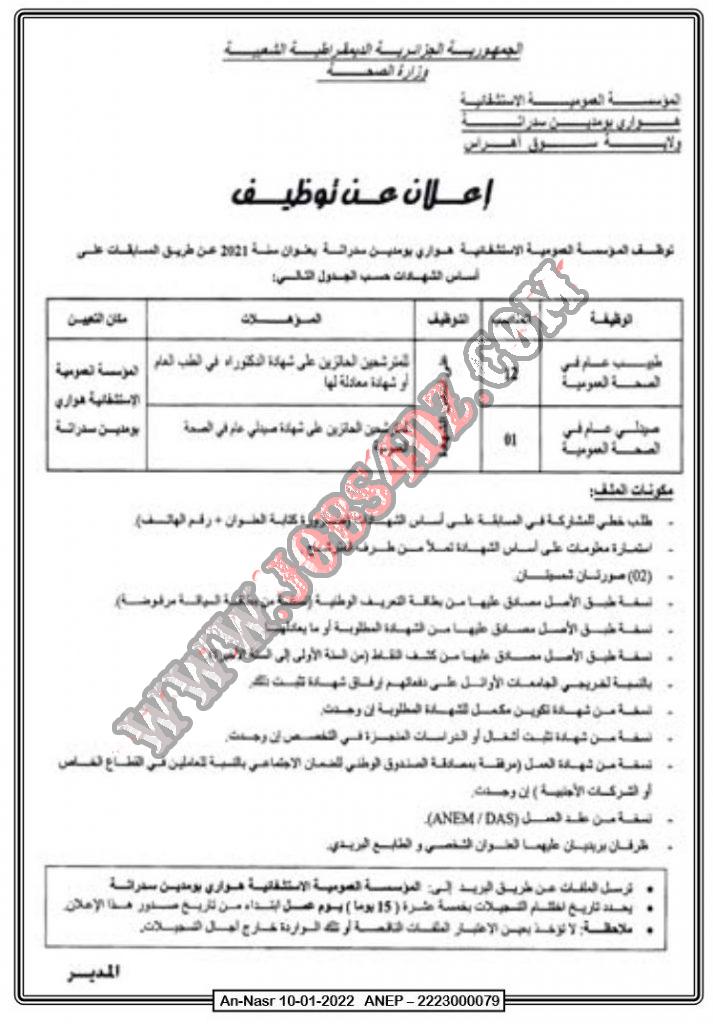 تعلن المؤسسة العمومية الاستشفائية هواري بومدين سدراتة سوق اهراس عن فتح مسابقة توظيف على اساس الشهادة في المناصب التالية