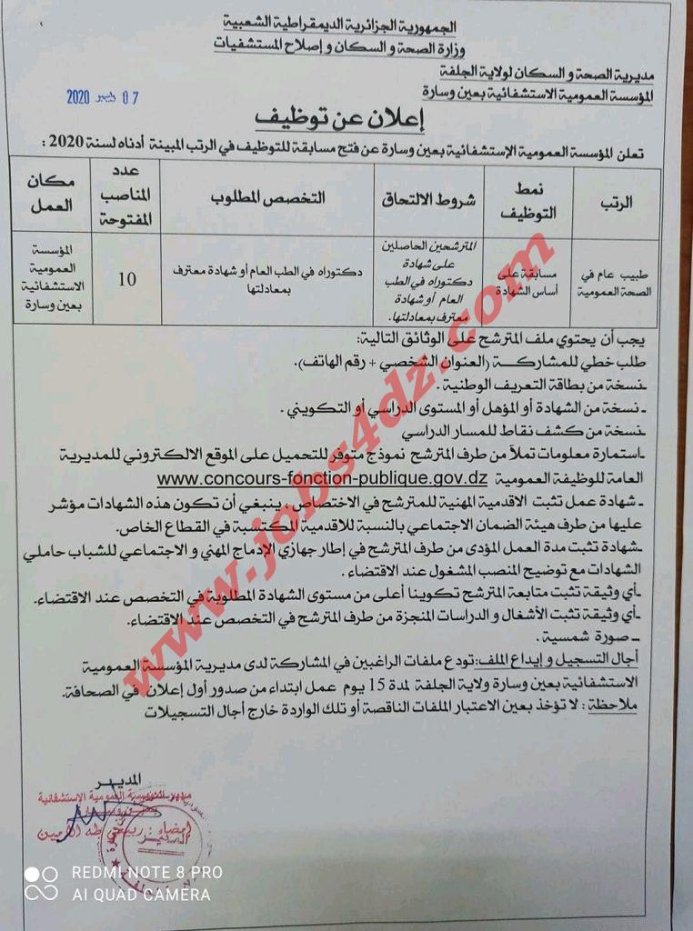 تعلن المؤسسة العمومية الاستشفائبة بعين وسارة عن فتح مسابقة للتوظيف في الرتب المبينة ادناه لسنة 2020