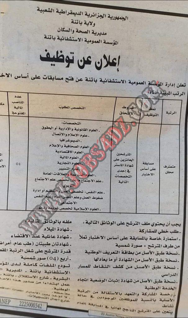 تعلن المؤسسة العمومية الاستشفائية باتنة عن فتح مسابقة توظيف على أساس الاختبار في الرتب المبينة أدناه