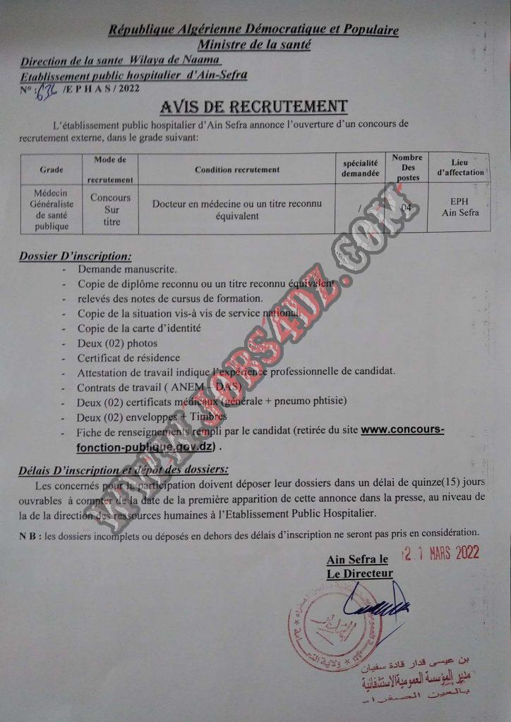 تعلن المؤسسة العمومية الاستشفائية بالعين الصفراء عن فتح مسابقات للتوظيف في الرتب المبينة ادناه