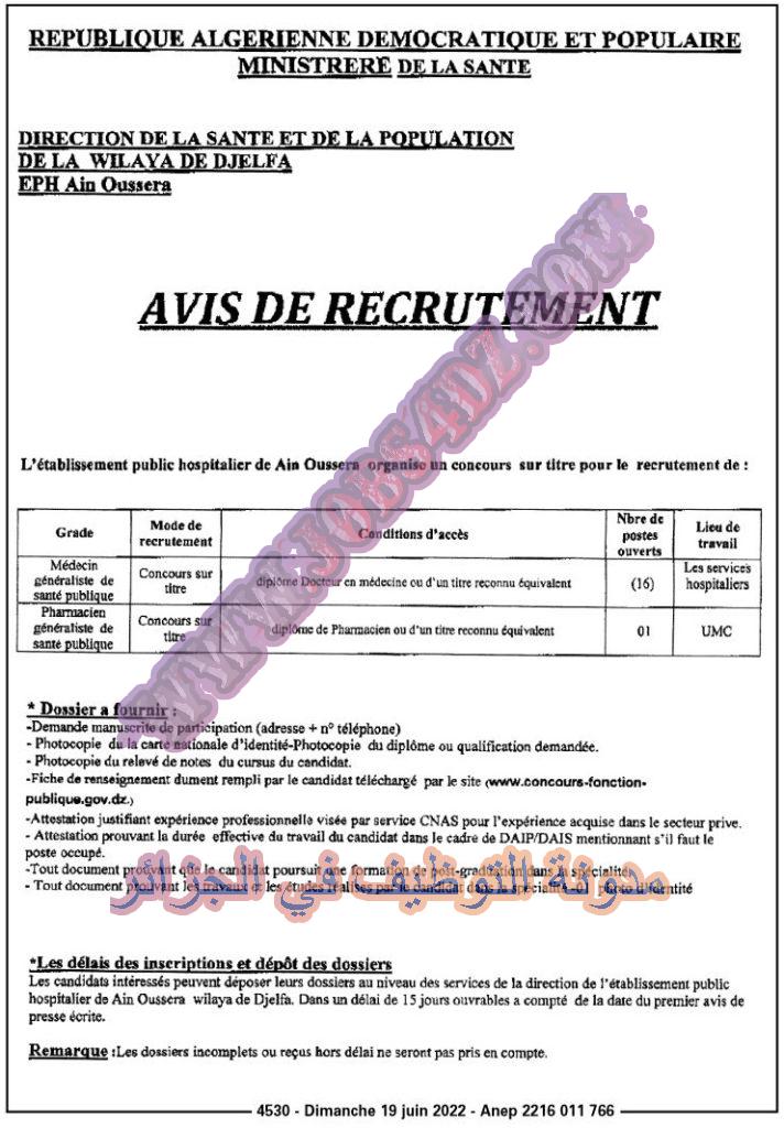 تعلن المؤسسة العمومية الاستشفائية عين وسارة الجلفة عن فتح مسابقة توظيف على اساس الشهادة بعنوان السنة المالية 2022 في المناصب المبينة ادناه