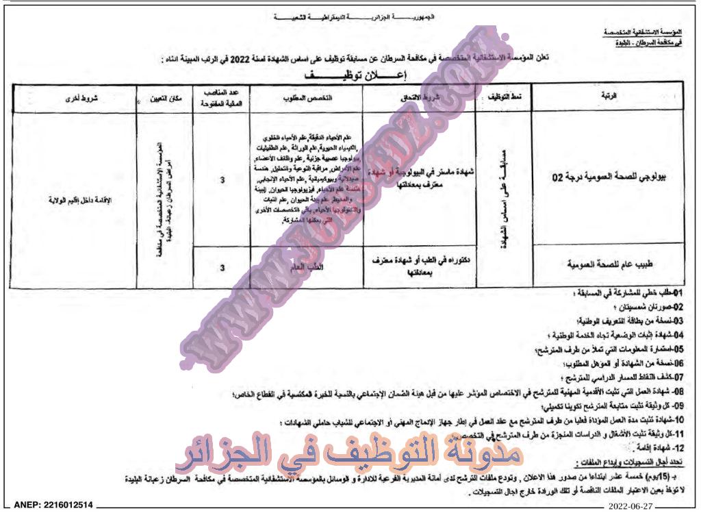 تعلن المؤسسة العمومية الاستشفائية المتخصصة في مكافحة السرطان البليدة عن فتح توظيف على اساس الشهادة بعنوان السنة المالية 2022 في المناصب المبينة ادناه