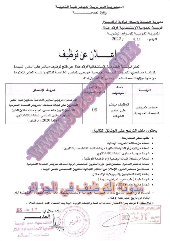 تعلن المؤسسة العمومية الاستشفائية اولاد جلال عن فتح توظيف مباشر في المناصب المبينة ادناه