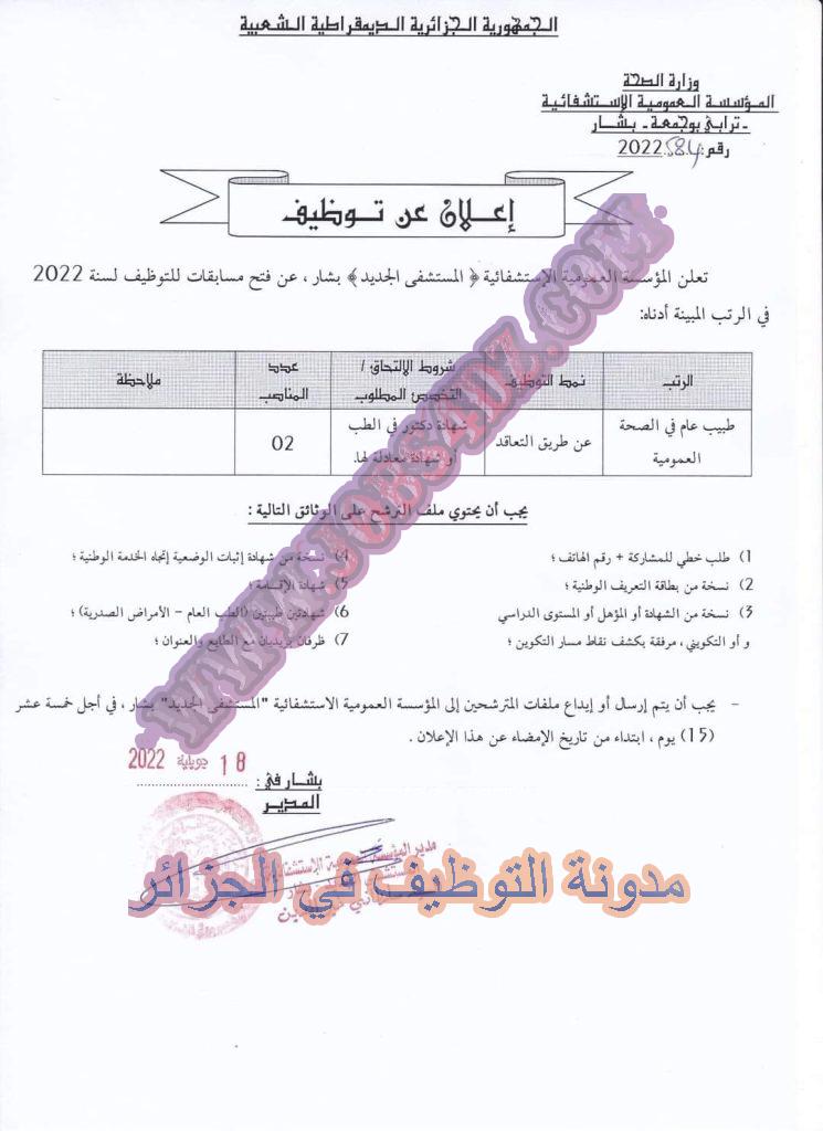 تعلن المؤسسة العمومية الاستشفائية المستشفى الجديد بشار عن فتح مسابقة توظيف على اساس الشهادة بعنوان السنة المالية 2022 في المناصب المبينة ادناه