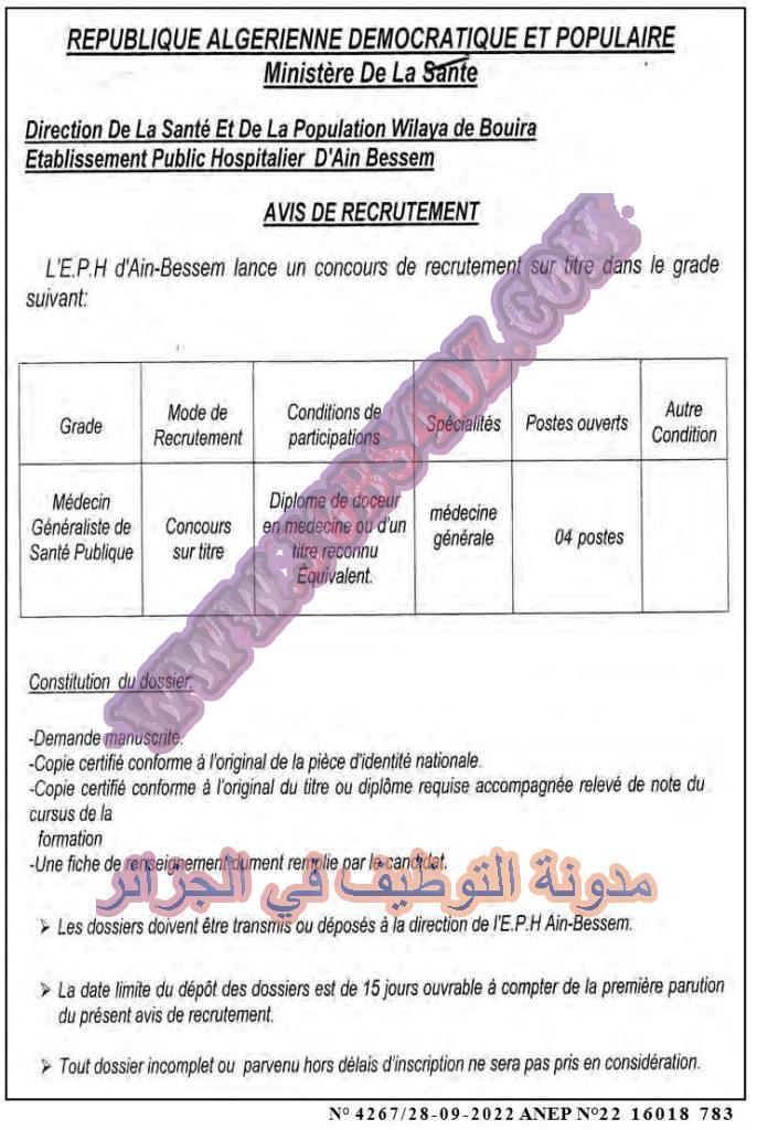 تعلن المؤسسة العمومية الاستشفائية عين بسام البويرة عن فتح مسابقة توظيف على اساس الشهادة في الرتب المبينة ادناه