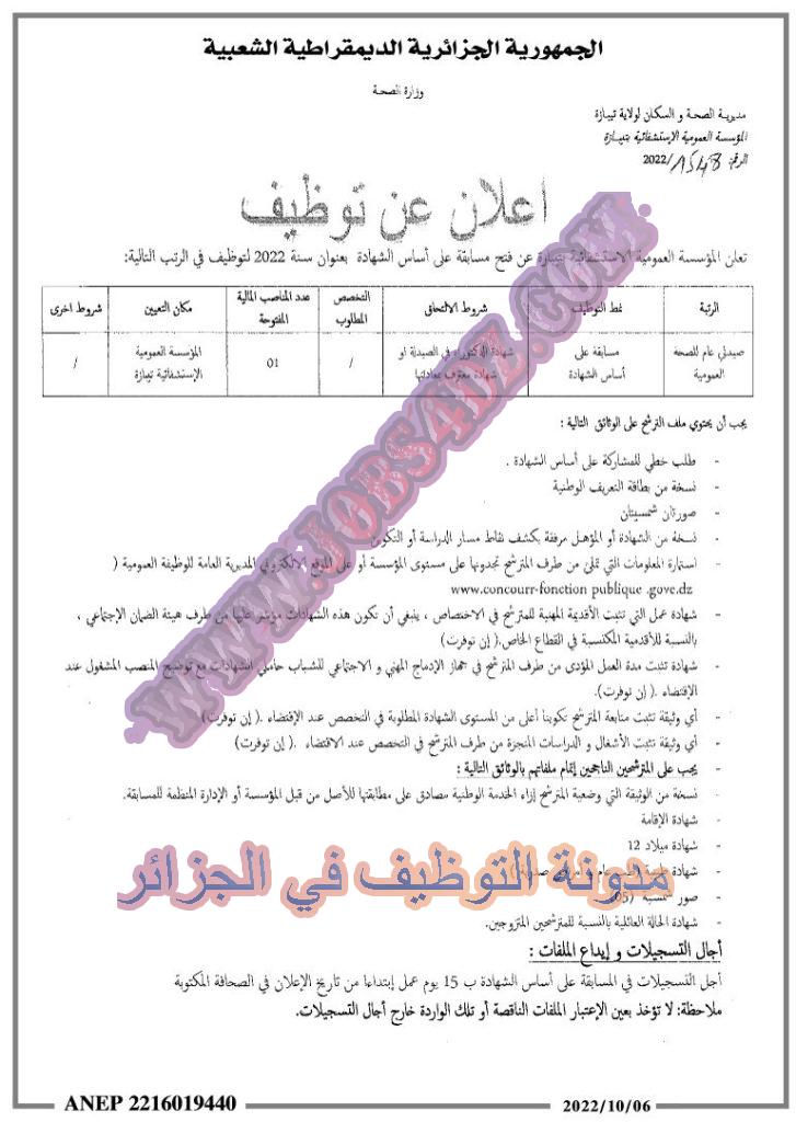 تعلن المؤسسة العمومية الاستشفائية تيبازة عن فتح مسابقة توظيف عن طريق الشهادةفي الرتب المبينة ادناه