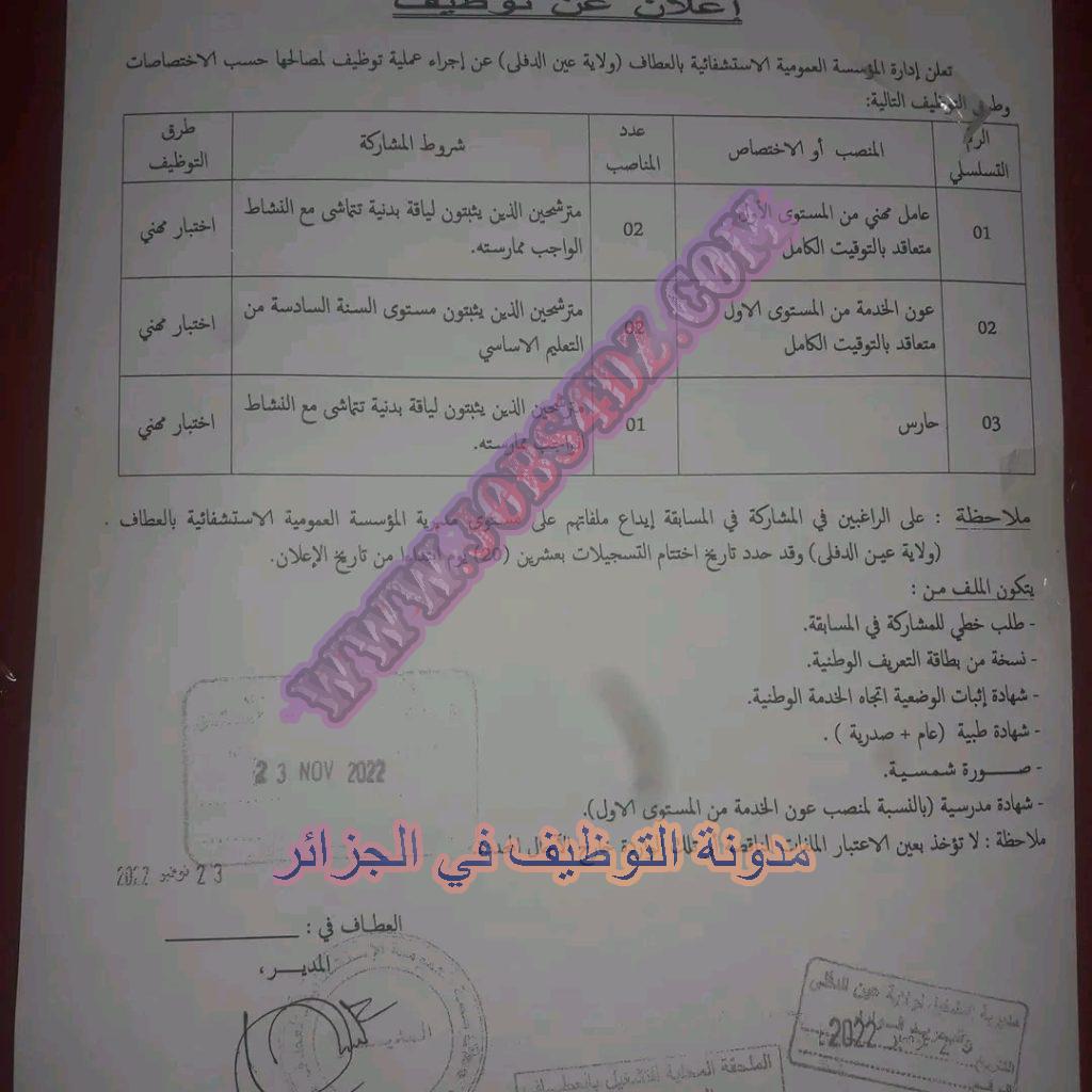تعلن المؤسسة العمومية الاستشفائية العطاف ولاية عين الدفلى عن فتح مسابقة توظيف على اساس الاختبار المهني في الرتب المبينة ادناه