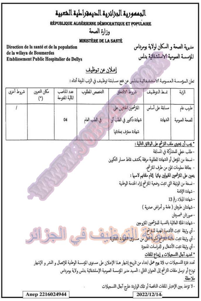 تعلن المؤسسة العمومية الاستشفائية بدلس ولاية بومرداس عن فتح مسابقة توظيف على اساس الشهادة في الرتب المبينة ادناه