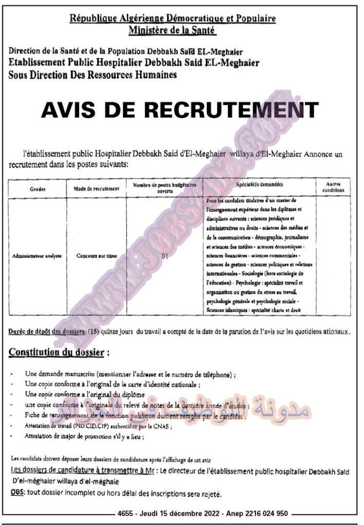 تعلن المؤسسة العمومية الاستشفائية دباخ السعيد المغير عن فتح مسابقة توظيف على اساس الشهادة في الرتب المبينة ادناه