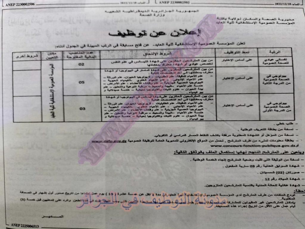 تعلن المؤسسة العمومية الاستشفائية ثنية العابد لولاية باتنة عن فتح مسابقة توظيف على اساس الاختبار في الرتب المبينة ادناه