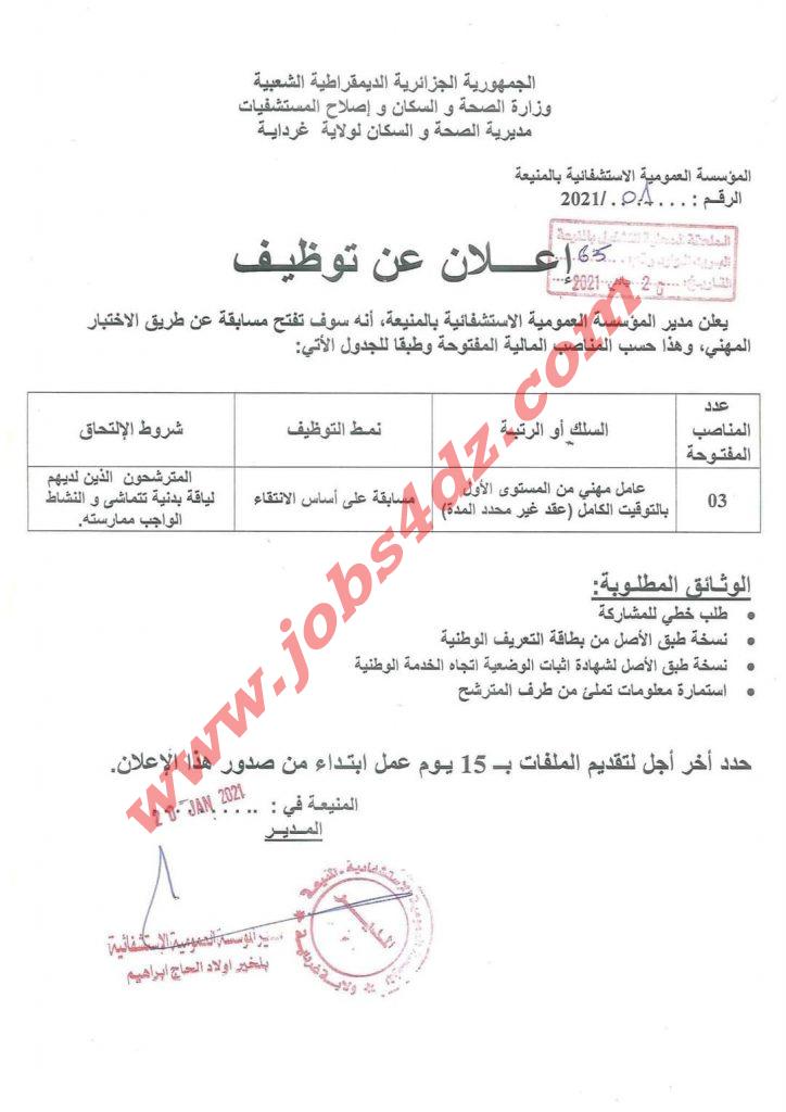 تعلن المؤسسة العمومية الاستشفائية بالمنيعة عن فتح مسابقة عن طريق الاختبار المهني في المناصب المبينة ادناه
