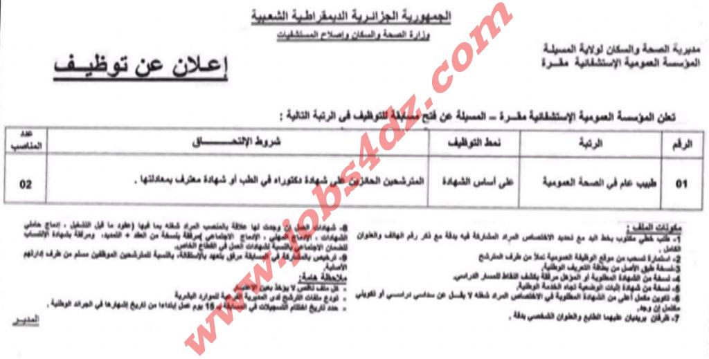 تعلن المؤسسة العمومية الاستشفائية مقرة بولاية المسيلة عن فتح مسابقة توظيف في المناصب التالية :