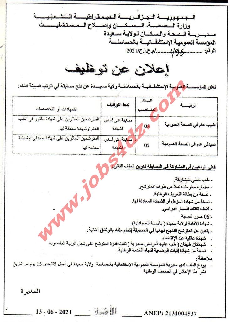 تعلن المؤسسة العمومية الاستشفائية بالحساسنة ولاية سعيدة عن فتح مسابقة في الرتب المبينة ادناه