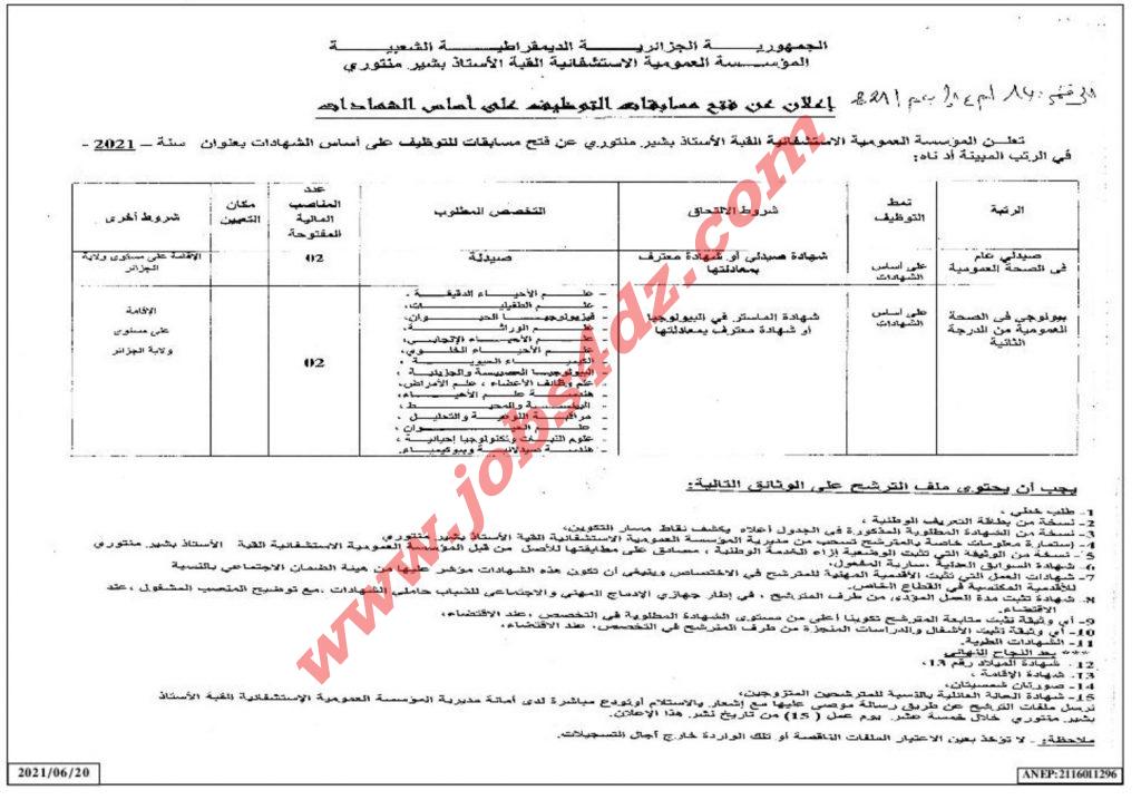 تعلن المؤسسة العمومية الاستشفائية القبة الاستاذ بشير منتوري عن فتح مسابقات للتوظيف على اساس الشهادات بعنوان سنة 2021 في الرتب التالية