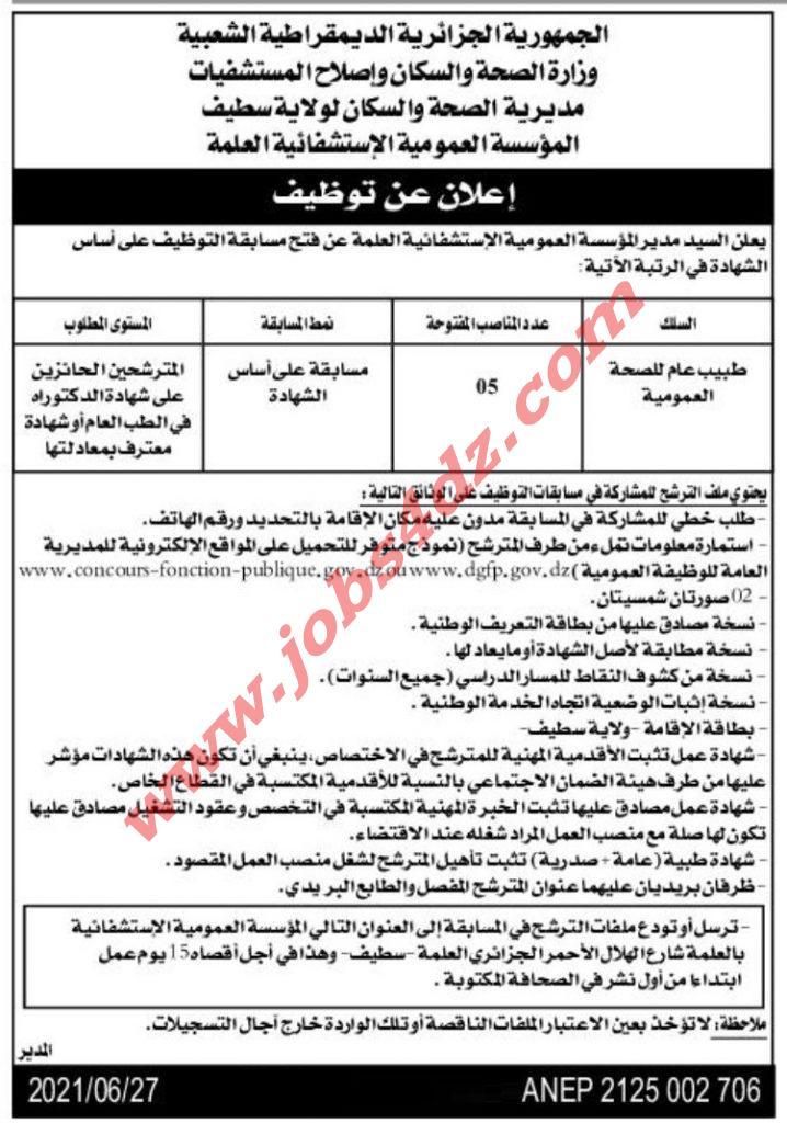 يعلن مدير المؤسسة العمومية الاستشفائية العلمة عن فتح مسابقة التوظيف على اساس الشهادة في الرتب التالية