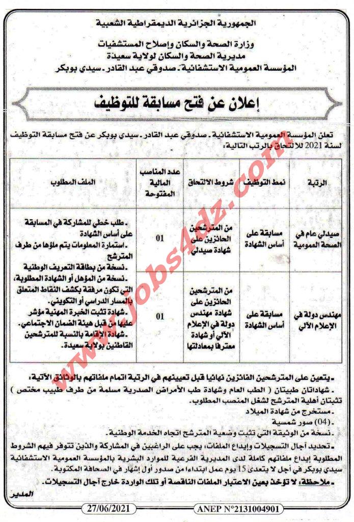 تعلن المؤسسة العمومية الاستشفائية صدوقي عبد القادر سيدي بوبكر عن فتح مسابقة للتوظيف لسنة 2021 في الرتب التالية