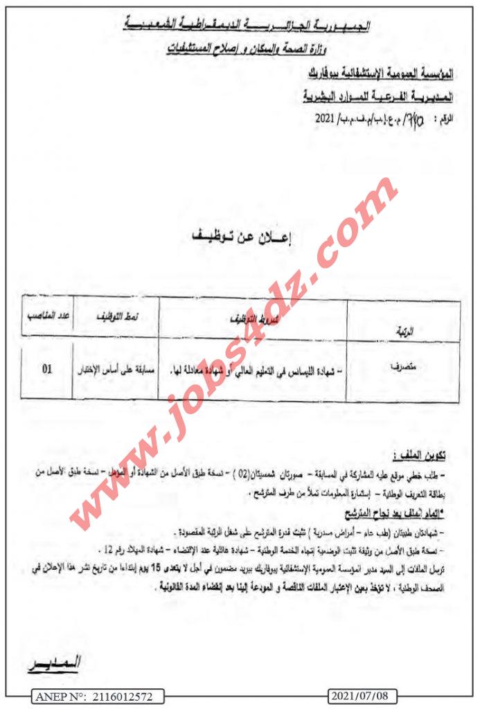 تعلن المؤسسة العمومية الاستشفائية بوفاريك ولاية البليدة عن توظيف على اساس الاختبار المهني في المناصب التالية