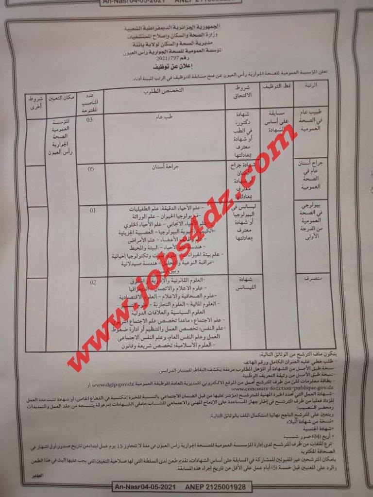 تعلن المؤسسة العمومية للصحة الجوارية راس العيون عن ففتح مسابقة للتوظيف في الرتب المبينة ادناه