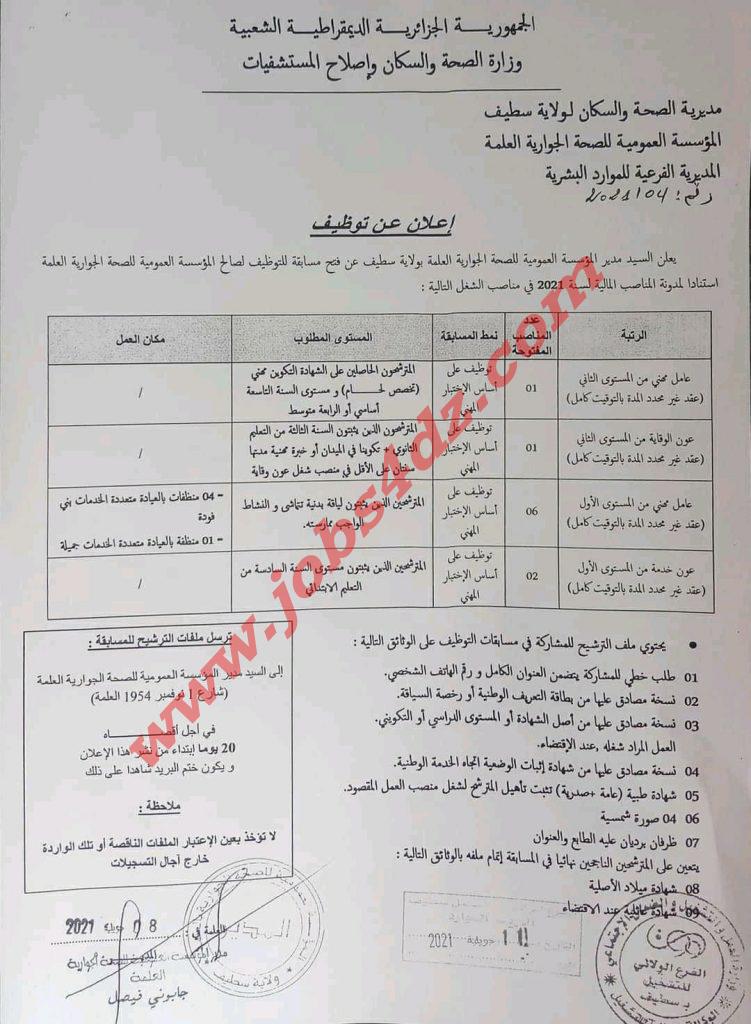 يعلن مدير المؤسسة العمومية للصحة الجوارية العلمة بولاية سطيف عن فتح مسابقة للتوظيف لصالح المؤسسة العمومية للصحة الجوارية العلمة في المناصب الشغل التالية