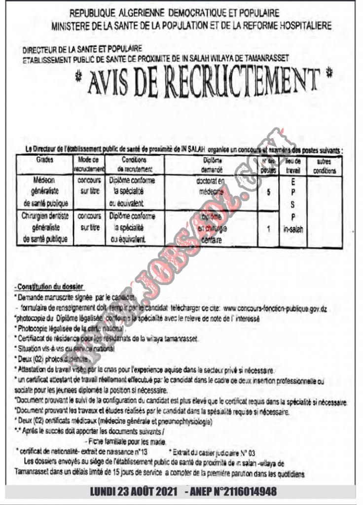 يعلن مدير المؤسسة العمومية للصحة الجوارية عين صالح تمنراست عن فتح مسابقة توظيف في المناصب المدونة ادناه