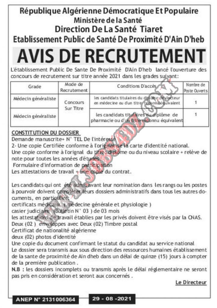 تعلن المؤسسة العمومية للصحة الجوارية عين الذهب تيارت عن فتح توظيف للسنة المالية 2021 في المناصب التالية