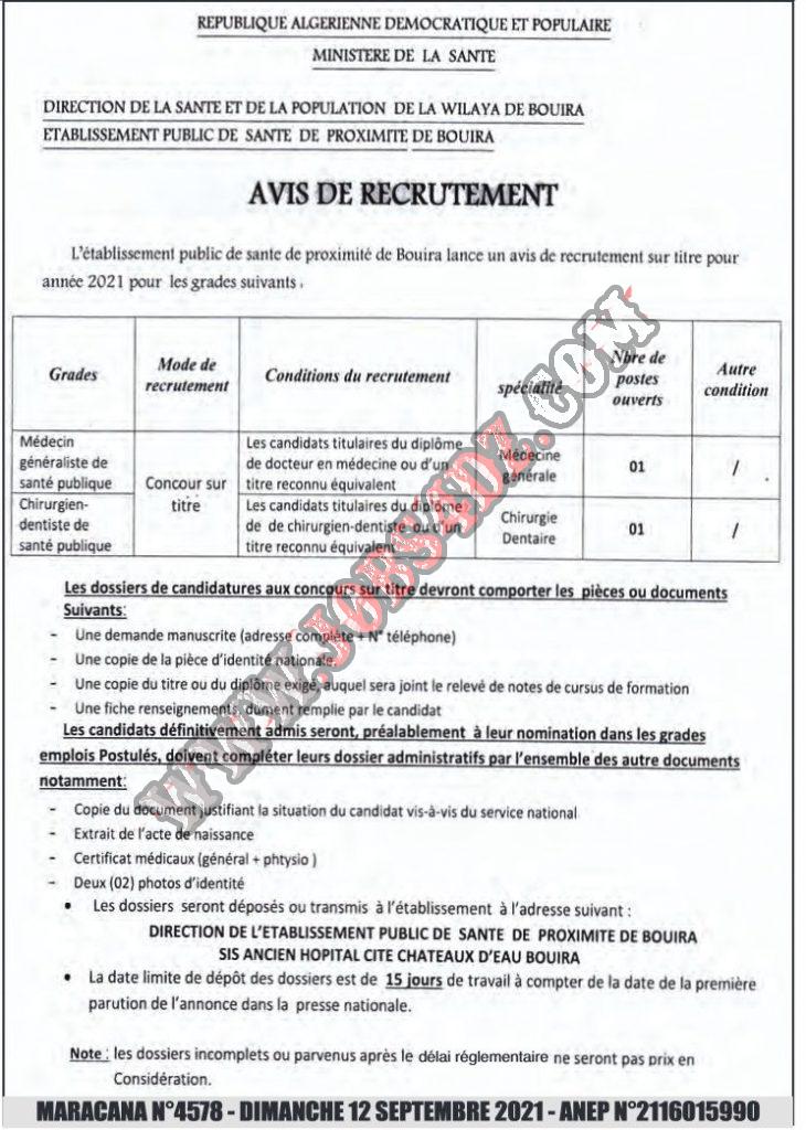 تعلن المؤسسة العمومية للصحة الجوارية لولاية البويرة عن توظيف على اساس الشهادة للسنة المالية 2021 في المناصب التالية
