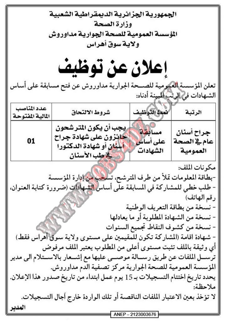 تعلن المؤسسة العمومية للصحة الجوارية مداروش عن فتح مسابقة على اساس الشهادات في الرتب المبينة ادناه