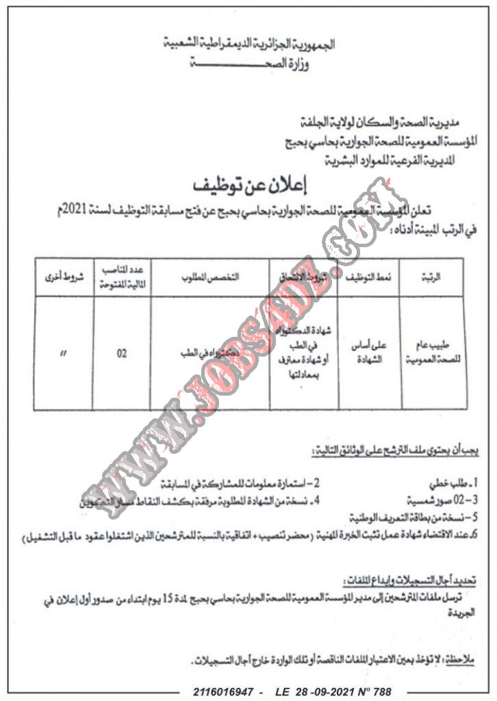 اعلان توظيف بالمؤسسة العمومية للصحة الجوارية بحاسي بحبح الجلفة