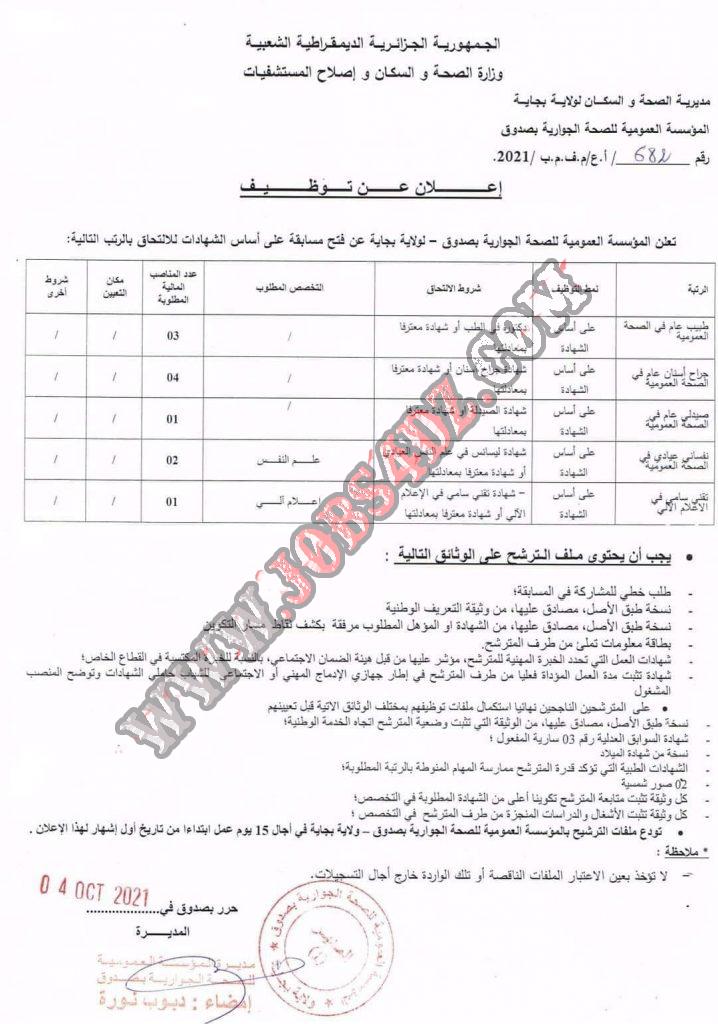 تعلن المؤسسة العمومية للصحة الجوارية بصدوق ولاية بجاية عن فتح مسابقة توظيف على اساس الشهادات في المناصب التالية