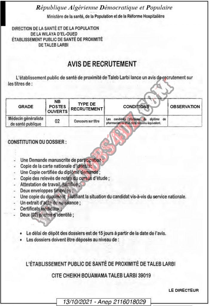 تعلن ادارة المؤسسة العمومية للصحة الجوارية طالب لعربي بولاية الوادي عن فتح مسابقة للتوظيف على اساس الشهادة في المناصب التالية