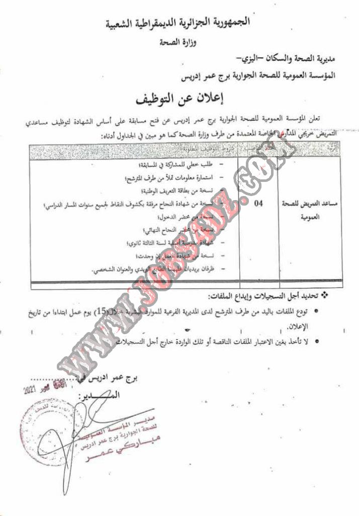 تعلن المؤسسة العمومية للصحة الجوارية برج عمر ادريس اليزي عن فتح مسابقات للتوظيف في الرتب التالية