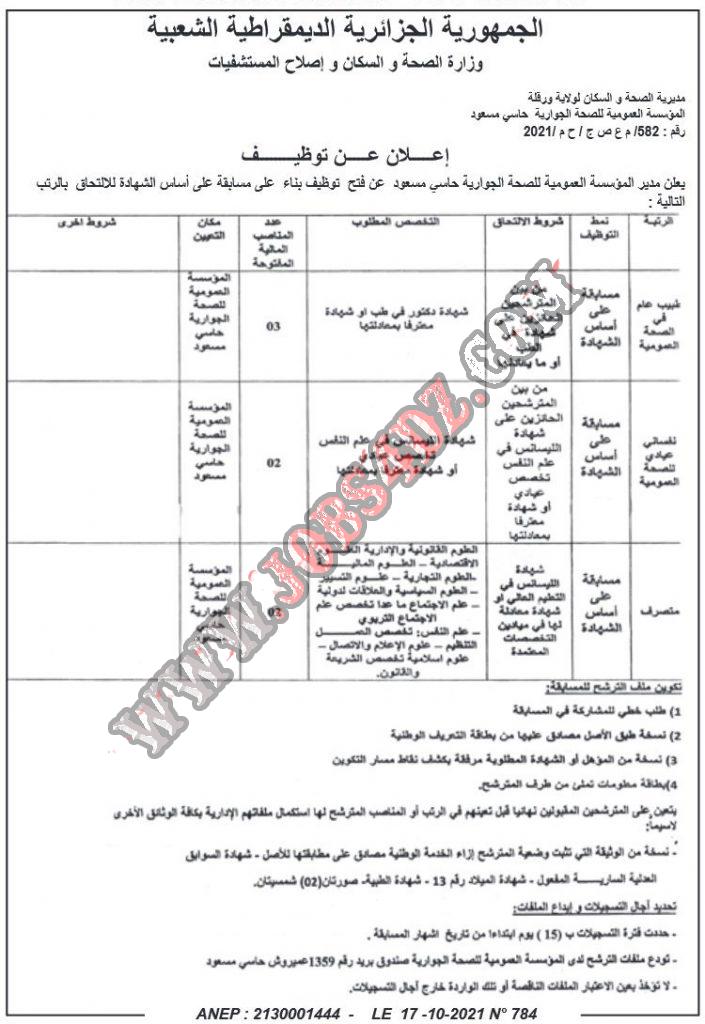 تعلن بالمؤسسة العمومية للصحة الجوارية حاسي مسعود بولاية ورقلة عن فتح مسابقات للتوظيف في الرتب التالية