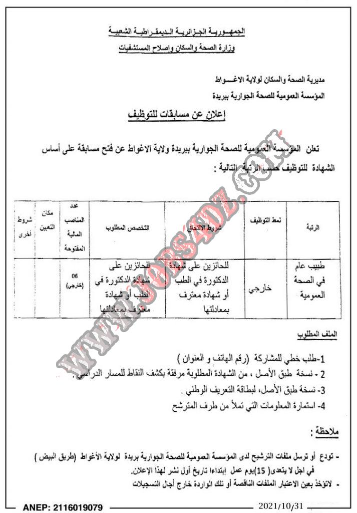 تعلن المؤسسة العمومية للصحة الجوارية بريدة ولاية الاغواط عن توظيف عن فتح مسابقة للتوظيف في الرتب التالية