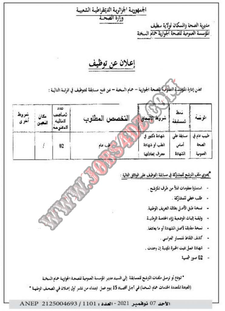 تعلن المؤسسة العمومية للصحة الجوارية حمام السخنة سطيف عن فتح مسابقة للتوظيف في الرتب التالية