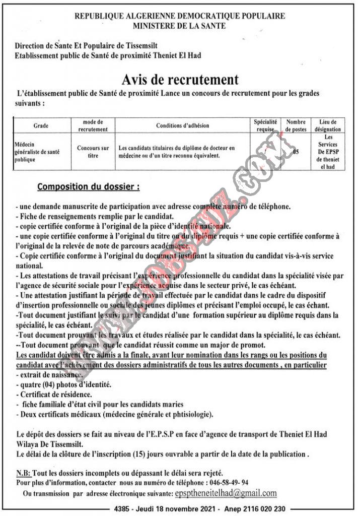 تعلن المؤسسة العمومية للصحة الجوارية عن فتح مسابقة توظيف على اساس الشهادة في المناصب التالية