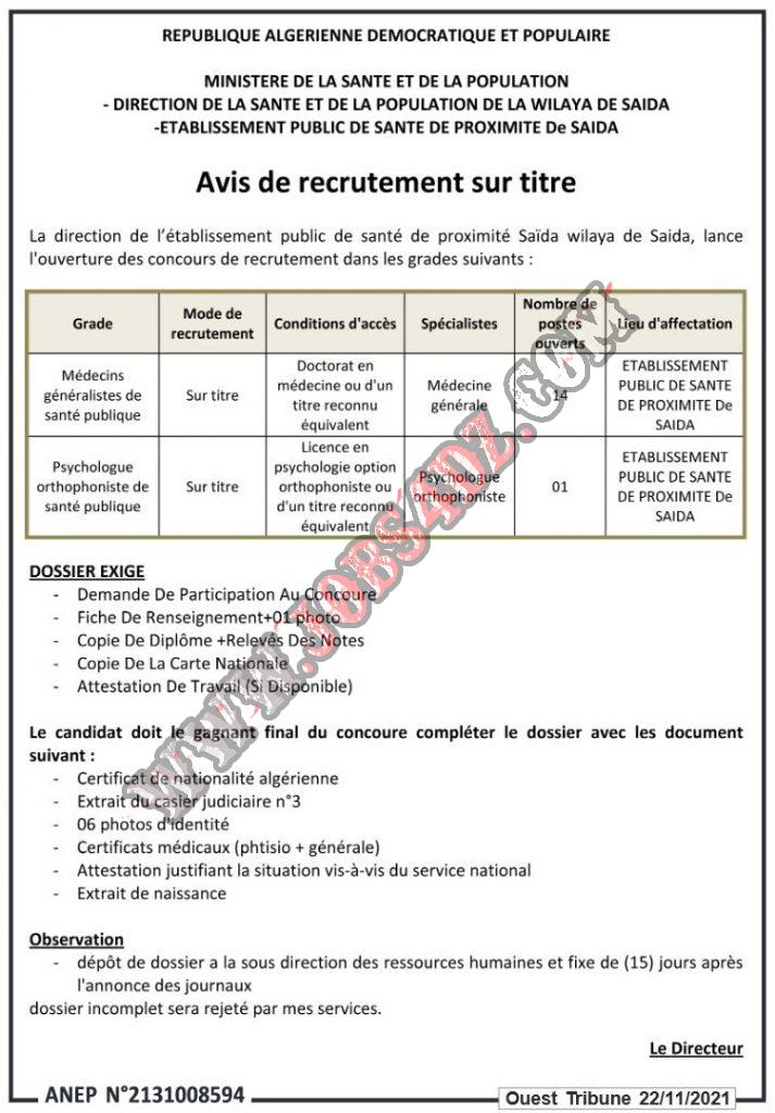 تعلن المؤسسة العمومية للصحة الجوارية سعيدة عن فتح مسابقة للتوظيف في الرتب المبينة ادناه لسنة 2021