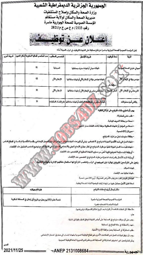 تعلن المؤسسة العمومية للصحة الجوارية ماسرة ولاية مستغانم عن فتح مسابقة توظيف على اساس الشهادة في الرتب المبينة ادناه
