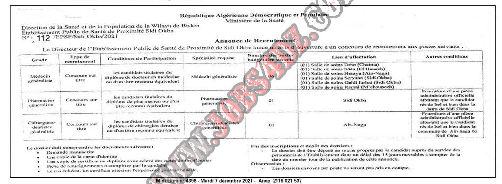 تعلن ادارة المؤسسة العمومية للصحة الجوارية سيدي عقبة بسكرة عن فتح مسابقة توظيف على اساس الشهادات في المناصب التالية