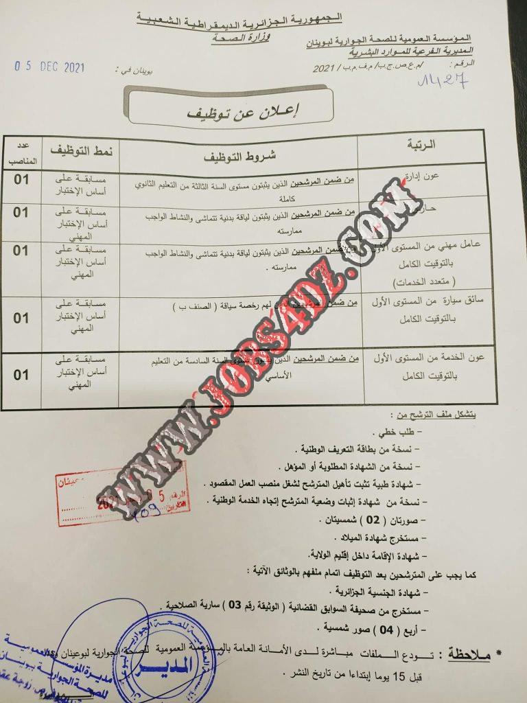 تعلن المؤسسة العمومية للصحة الجوارية ببرج منايل لولاية بومرداس عن توظيف على اساس الشهادة في الرتب المبينة ادناه