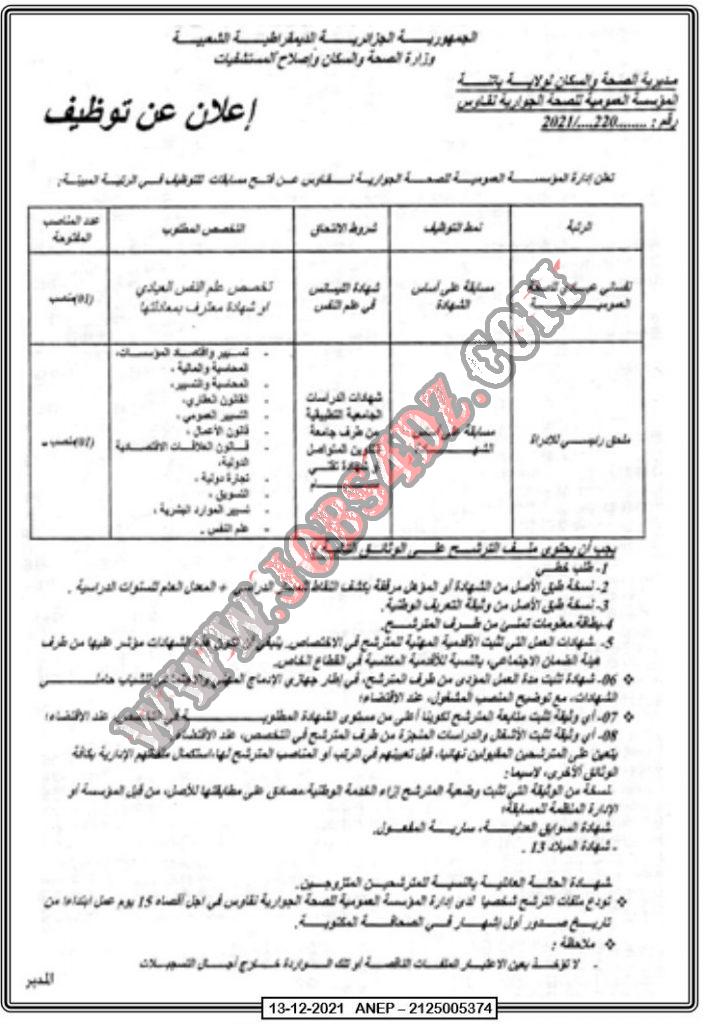 تعلن المؤسسة العمومية للصحة الجوارية نقاوس باتنة عن فتح مسابقة توظيف على اساس الشهادات في المناصب التالية