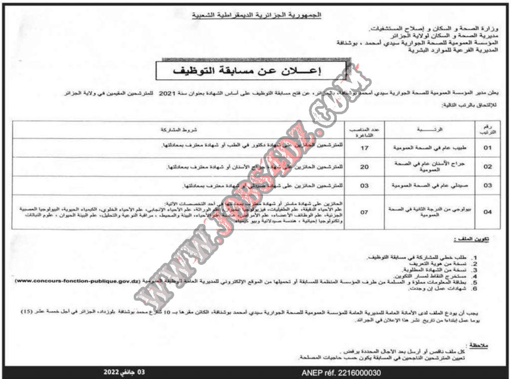 تعلن المؤسسة العمومية للصحة الجوارية سيدي امحمد بوشنافة الجزائر العاصمة عن فتح مسابقة توظيف على اساس الشهادة في المناصب التالية