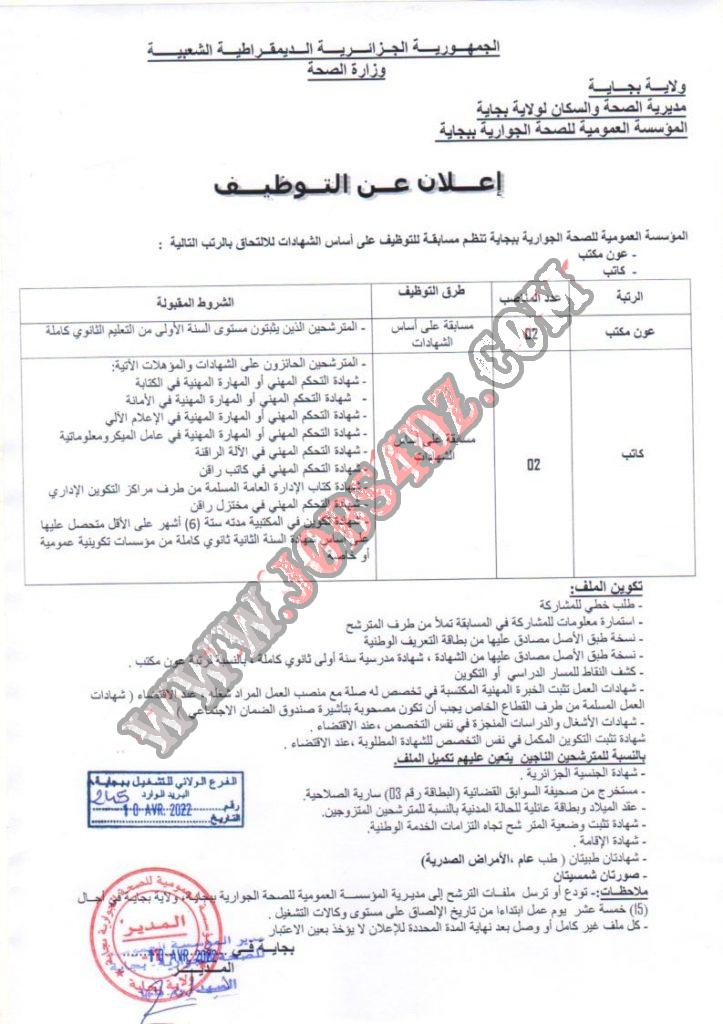 تعلن المؤسسة العمومية للصحة الجوارية ببجاية عن فتح مسابقة توظيف على اساس الشهادة للسنة المالية 2022 في المناصب التالية