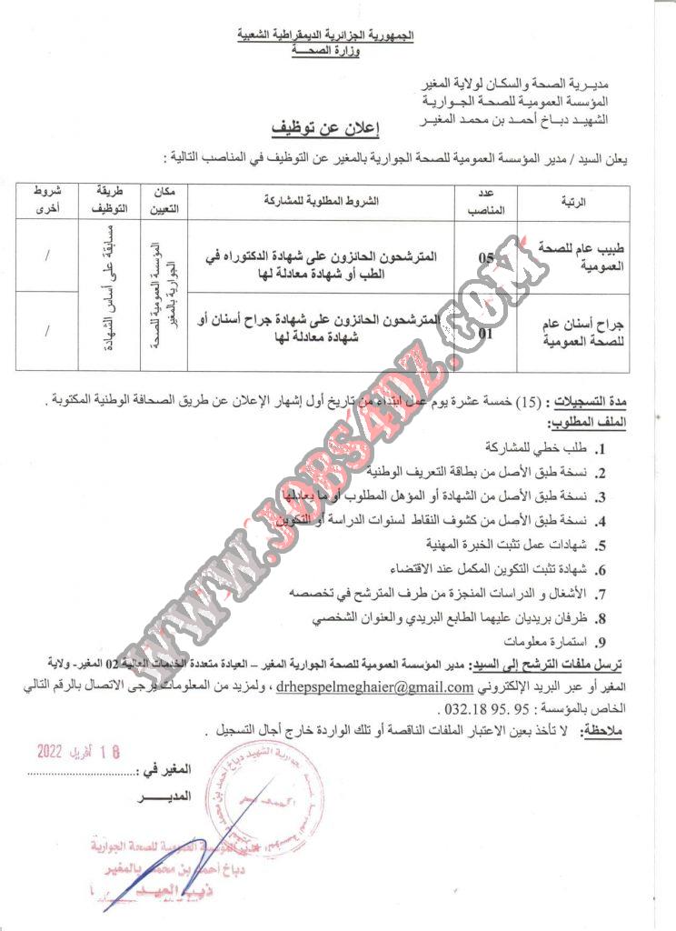 تعلن المؤسسة العمومية للصحة الجزارية بالمغير عن فتح مسابقة توظيف على اساس الشهادة في المناصب التالية