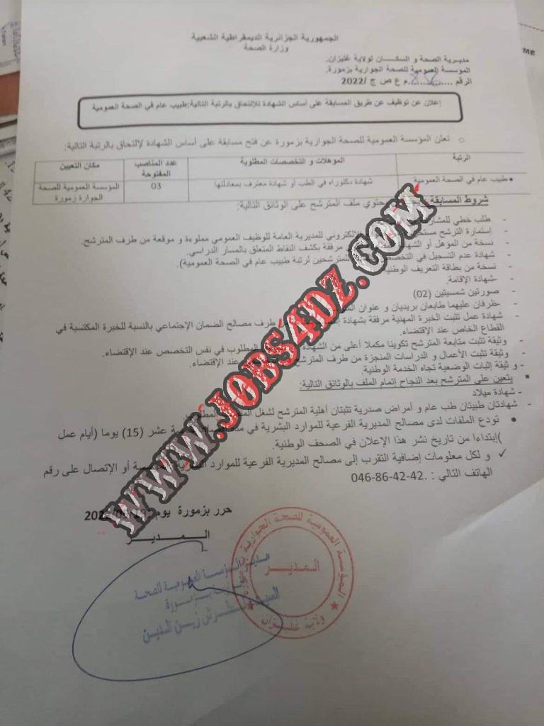 تعلن المؤسسة العمومية للصحة الجوارية بزمورة ولاية غليزان عن فتح مسابقة توظيف على اساس الشهادة بعنوان سنة2022 للالتحاق بالرتبة التالية