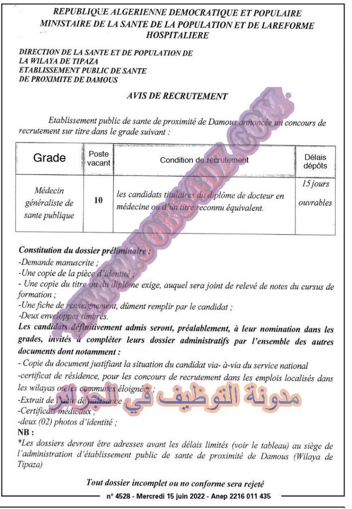 تعلن المؤسسة العمومية للصحة الجوارية بالداموس تيبازة عن فتح مسابقة توظيف على اساس الشهادة بعنوان السنة المالية 2022 في المناصب المبينة ادناه