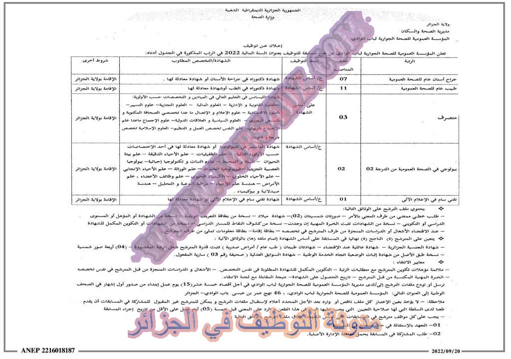تعلن المؤسسة العمومية للصحة الجوارية لباب الوادي عن فتح مسابقة توظيف على اساس الشهادة في الرتب المبينة ادناه