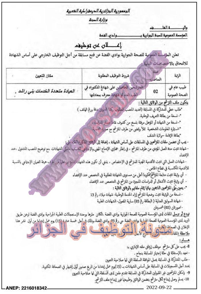 تعلن المؤسسة العمومية للصحة الجوارية بوادي الفضة الشلف عن فتح مسابقة توظيف على اساس الشهادة في الرتب المبينة ادناه