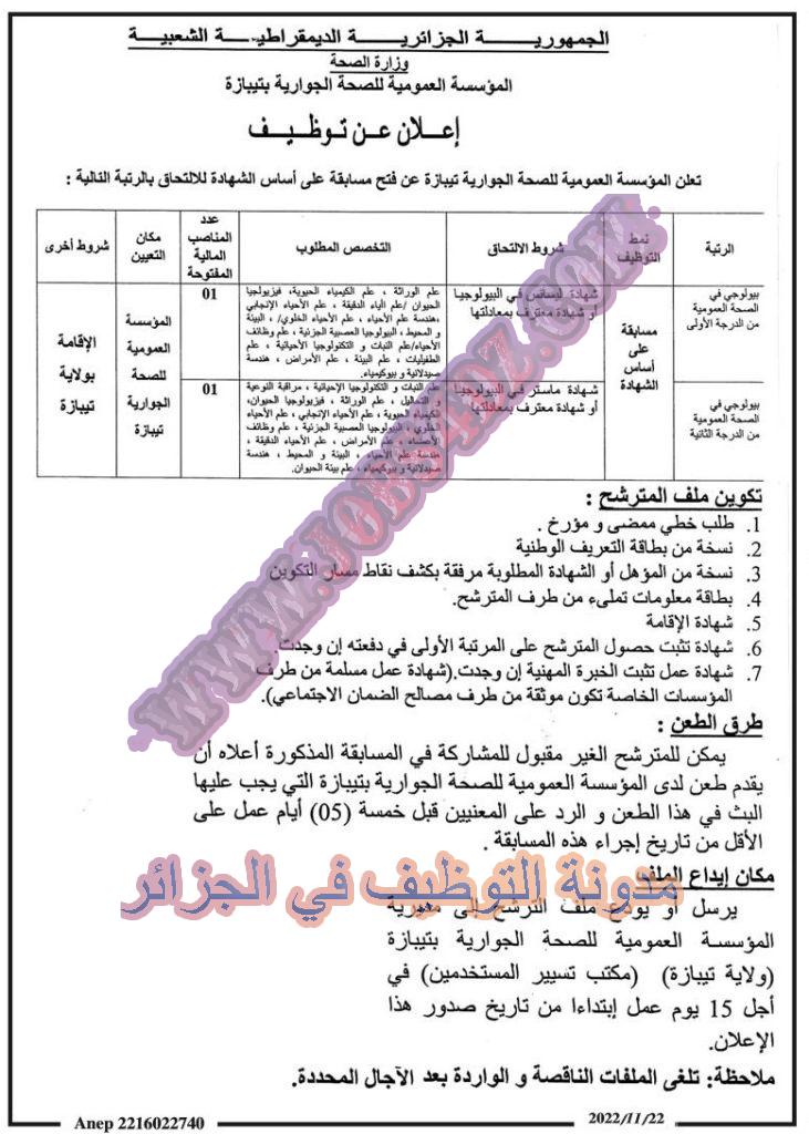 تعلن المؤسسة العمومية للصحة الجوارية تيبازة عن فتح مسابقة توظيف على اساس الشهادة في الرتب المبينة ادناه