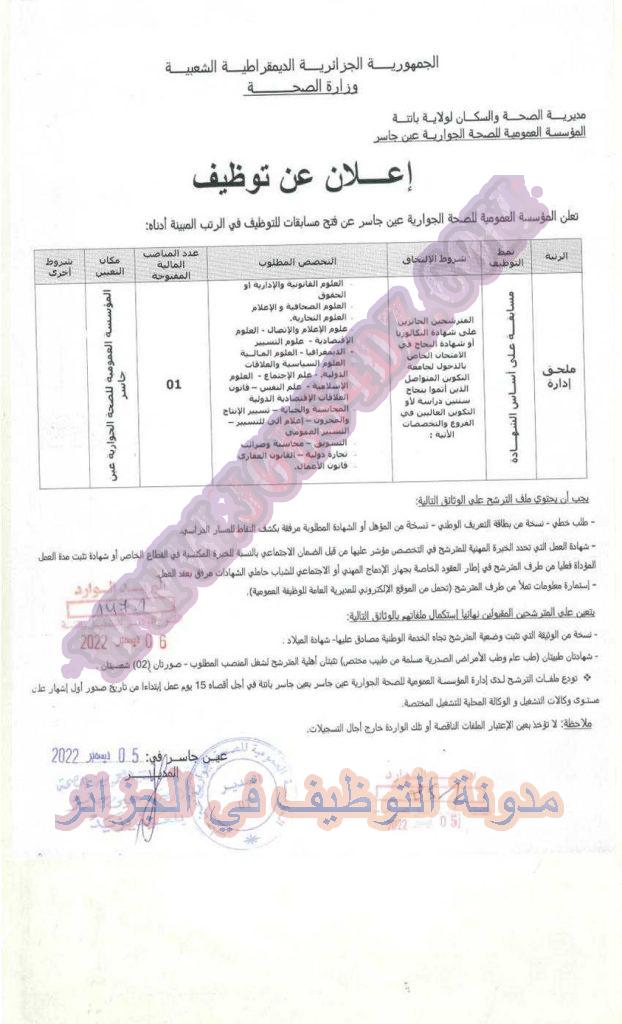 تعلن المؤسسة العمومية للصحة الجوارية عين جاسر لولاية باتنة عن فتح مسابقة توظيف على اساس الشهادة في الرتب المبينة ادناه
