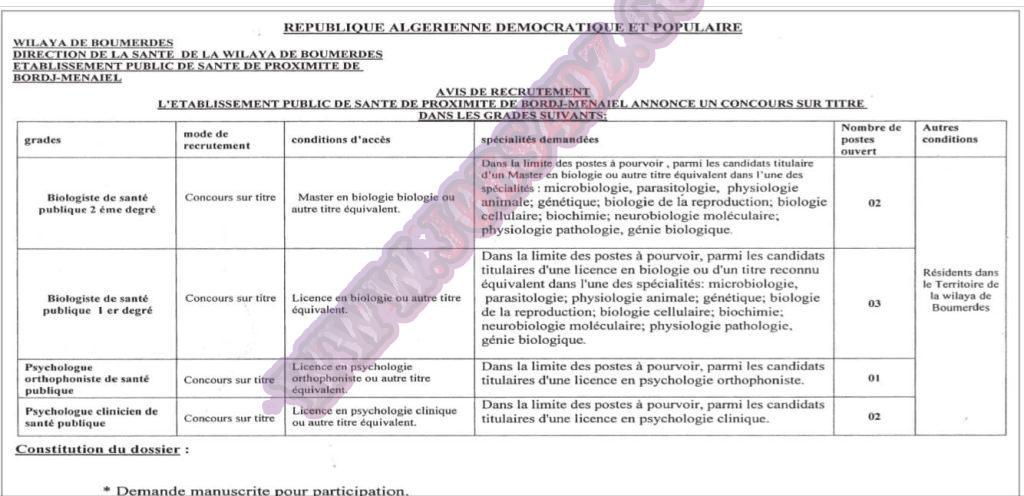 تعلن المؤسسة العمومية للصحة الجوارية ببرج منايل بولاية بومرداس عن فتح مسابقة توظيف على اساس الشهادة في الرتب المبينة ادناه